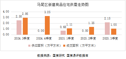 2025年三季度马尾区供应面积为2.15万平方米,同比下降14.00%,成交面积为1.05万平方米,环比下降22.22%,同比下降64.41%。