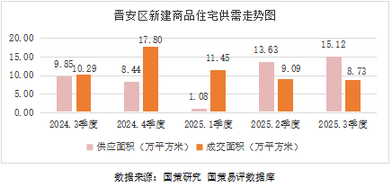 2025年三季度晋安区新建商品住宅供应面积为15.12万平方米,环比下降10.93%,同比上涨53.50%;成交面积为8.73万平方米,环比下降3.96%,同比下降15.16%。