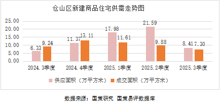 2025年三季度仓山区新建商品住宅供应面积为8.41万平方米,环比下降61.05%,同比上升32.85%;成交面积为7.30万平方米,环比下降26.11%,同比下降20.99%。