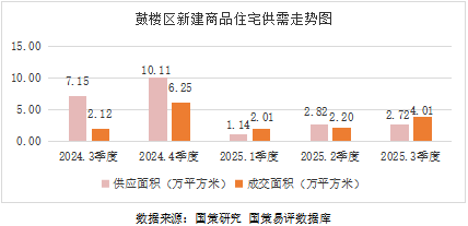 2025年三季度鼓楼区供应面积为2.72万平方米,环比下降3.55%,同比下降61.96%;成交面积为4.01万平方米,环比上涨82.27%,同比上涨89.15%。