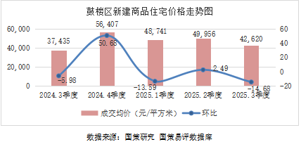 2025年三季度鼓楼区新建商品住宅成交均价高达42,620元/平方米,环比下降14.68%,同比上涨13.85%。