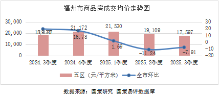 从成交均价来看,福州市2025年三季度商品房成交均价为17,597元/平方米,成交均价持续走低,环比下降7.91%,同比下降2.94%。其中,鼓楼区成交均价超越台江区重新登顶榜首,以26,256元/平方米的价格领跑福州商品房成交均价,台江区成交均价以24,549元/平方米紧追其后。