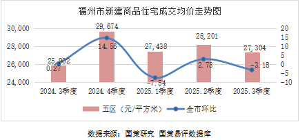2025年三季度福州市新建商品住宅成交均价为27,304元/平方米,成交均价维持稳定,变动幅度较小,环比下降3.18%,同比上升5.41%。