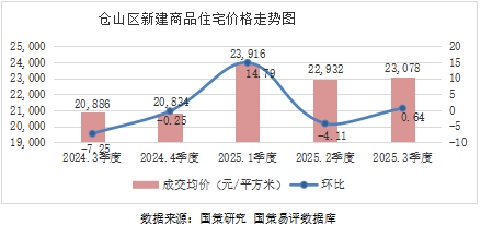 2025年三季度仓山区新建商品住宅成交均价为23,078元/平方米,环比上升0.64%,同比上升10.50%。
