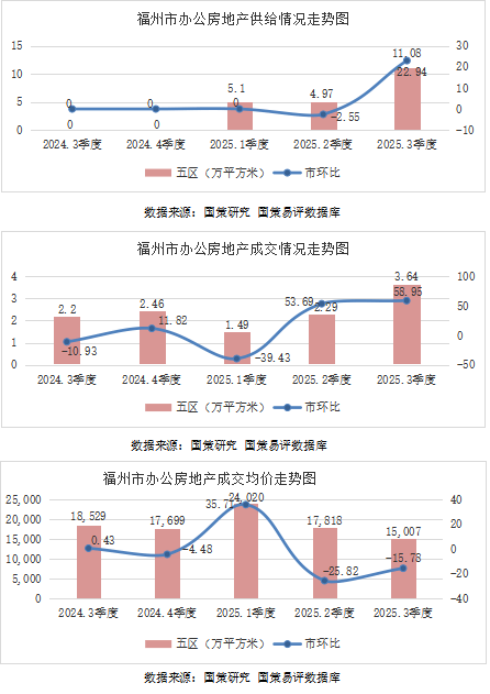 从供应量来看,福州市2025年三季度办公房地产供应面积11.08万平方米,环比上升22.94%;从成交量来看,福州市三季度办公房地产成交面积为3.64万平方米,环比上涨58.95%,同比上涨65.45%;从成交价格来看,福州市三季度办公房地产成交价格为15,007元/平方米,环比下降15.78%,同比下降19.01%。